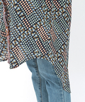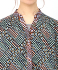 幾何学とお花をパネル調にデザインした生地をたっぷりと使った華やかな1枚。