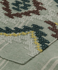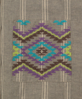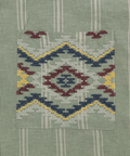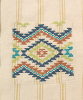 ナチュラルカラーのオリジナルストライプ生地、ネイティブアメリカンの織るラグ柄を刺繍にアレンジしたポケットがポイント。