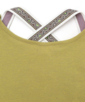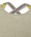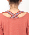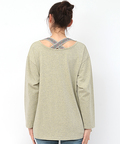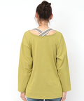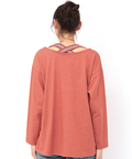 ボートネックから見えるレイヤード風の肩紐はバック部分でクロスしており、大人っぽい雰囲気に。