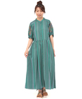 ふんわりとしたパフスリーブが女性らしく、首元はバンドカラーですっきりとした印象に。
