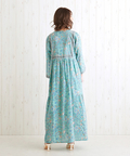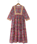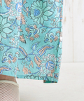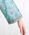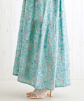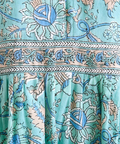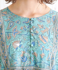 草花をモチーフにしたエスニックなブロックプリントが華やかなデザイン。