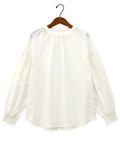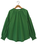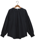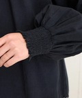 締め付け感の少ない袖口のシャーリングでキュッと細くし、フェミニンな雰囲気を与えます。