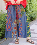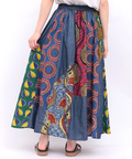 カジュアルなデニムに華やかなアフリカン柄が印象的!フレアロングスカート