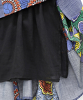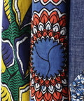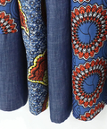 パッと目を惹く華やかなアフリカン柄とデニムを組み合わせた、大人エスニックなアイテム。