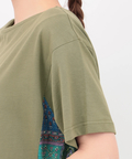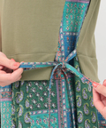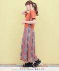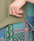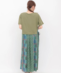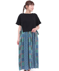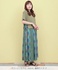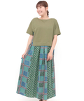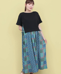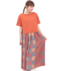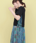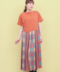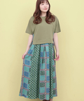 無地トップスと伝統的なブロックプリント柄がやさしく調和するドッキングワンピース