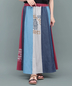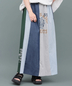デニムやカレッジプリント柄の生地を組み合わせた、カジュアルに着られるリメイク風スカート。