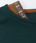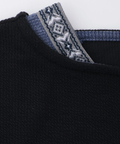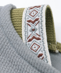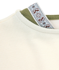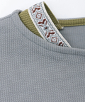 ボートネックの肩からのぞくエスニックテープが、シンプルな中に遊び心を添えるアクセントに。