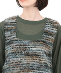 ふわふわのフェザービスチェと、シアー感のあるテレコ素材トップスのセット。