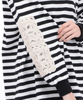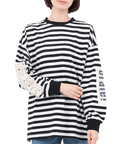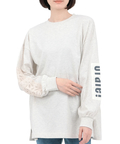 右袖には可愛らしいレース、左袖にはブランドネームパッチを施し、リメイク風のデザインに仕上げました。