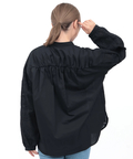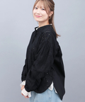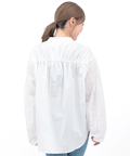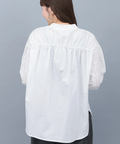 背中にギャザーを入れた、ゆったりシルエットのレース切替ブラウス。