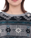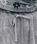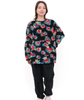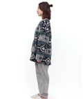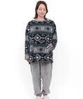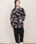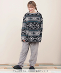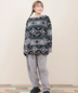 柄が目を引くクルーネックのボアトップスと、ぽこぽこした表面がかわいいボアパンツの組み合わせです♪