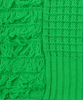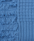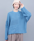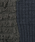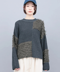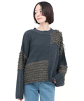 パッチワークのように切り替えた編地と、立体感を生むループフリンジが印象的なデザイン。