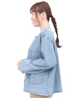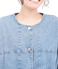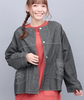 ポケットのステッチがアクセントのノーカラーデニムジャケット。