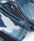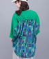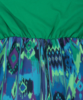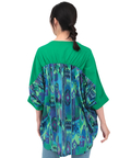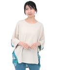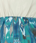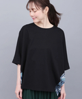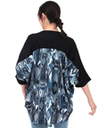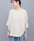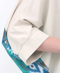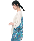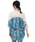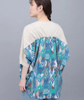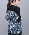 背中に大胆なイカット柄をあしらった、異素材コンビのデザイントップス。