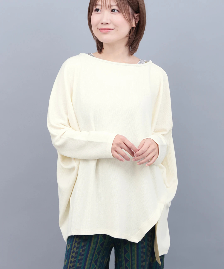 バックのふくれジャカードの切り替えが他にはない異素材MIXプルオーバー。ヒップが隠れるバックロングデザインと丸みのあるシルエットがポイントです。