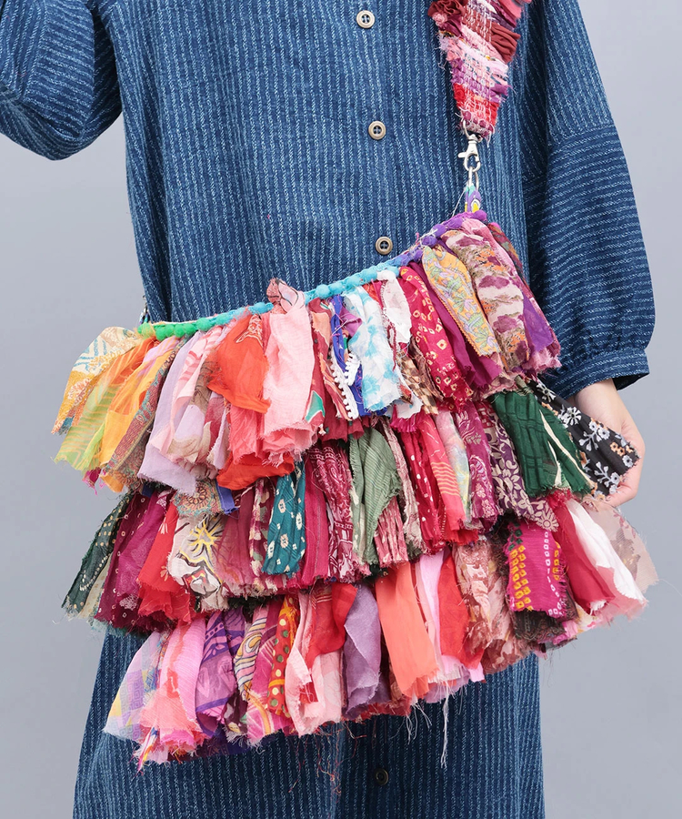 インドのオールドサリーを裂いて織り上げた、裂き織素材を使用したショルダーバッグ。表はカラフルで元気なフリル生地、背面は素朴な温もりのあるパッチワーク仕様。