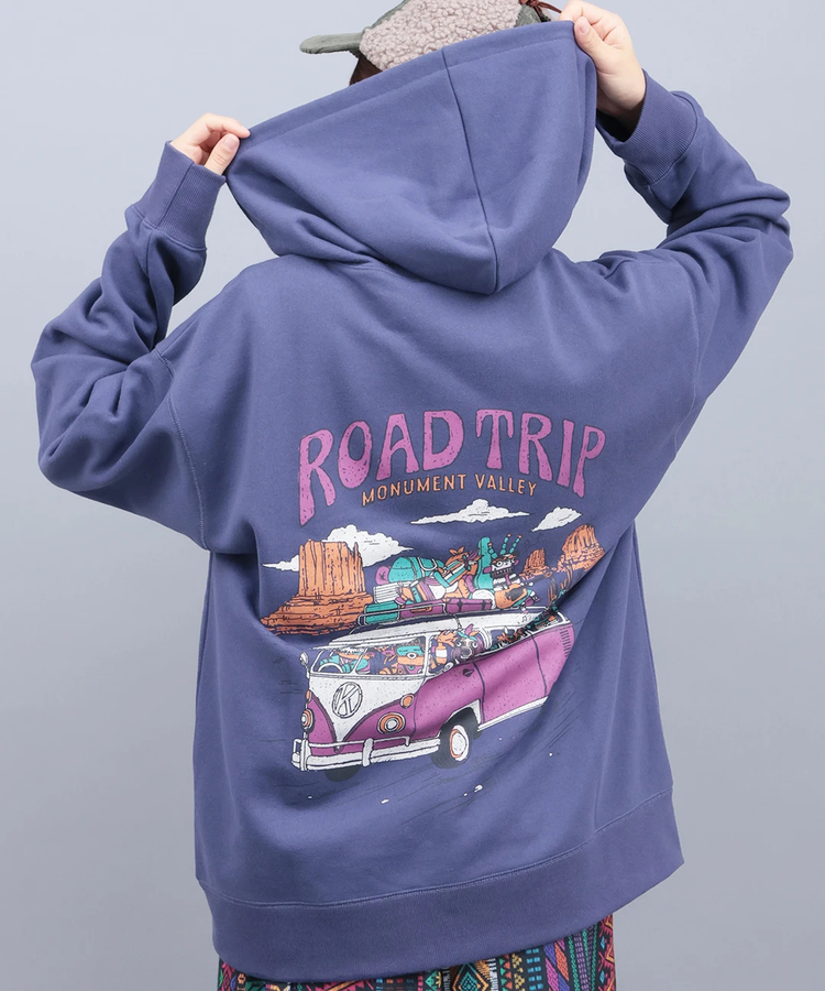 バックにチビカチナドールたちのロードトリップを描いたジップアップパーカー。かすれ加工を施したヴィンテージ風で程よいこなれ感を演出。