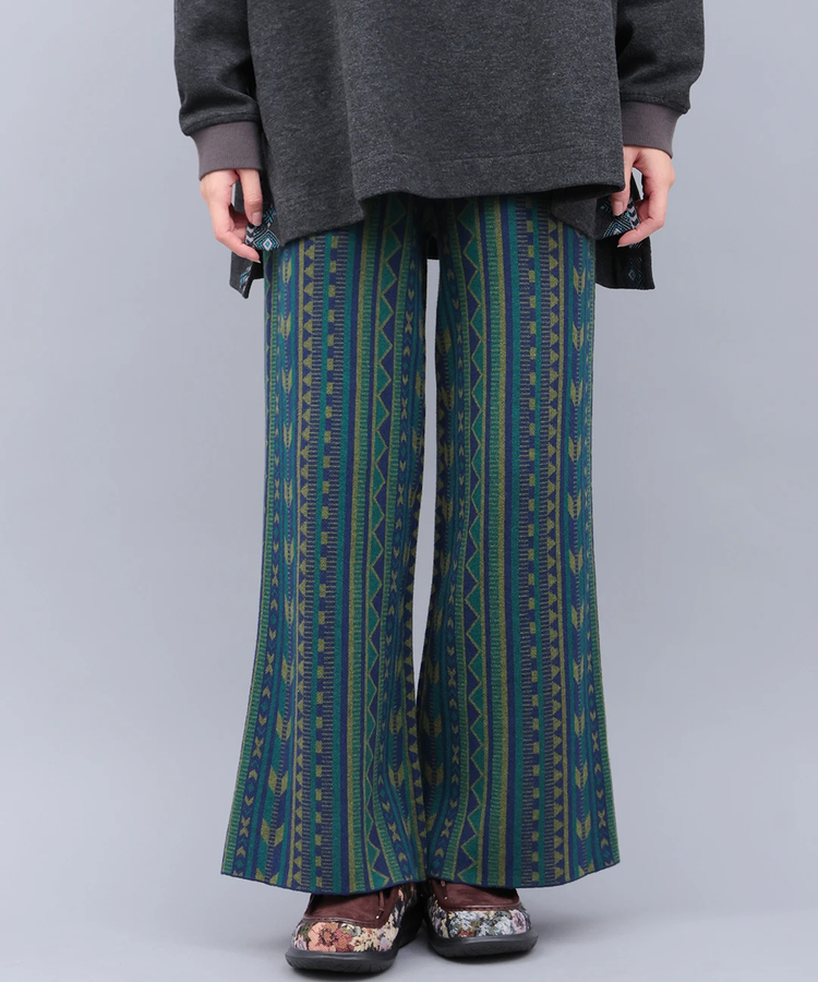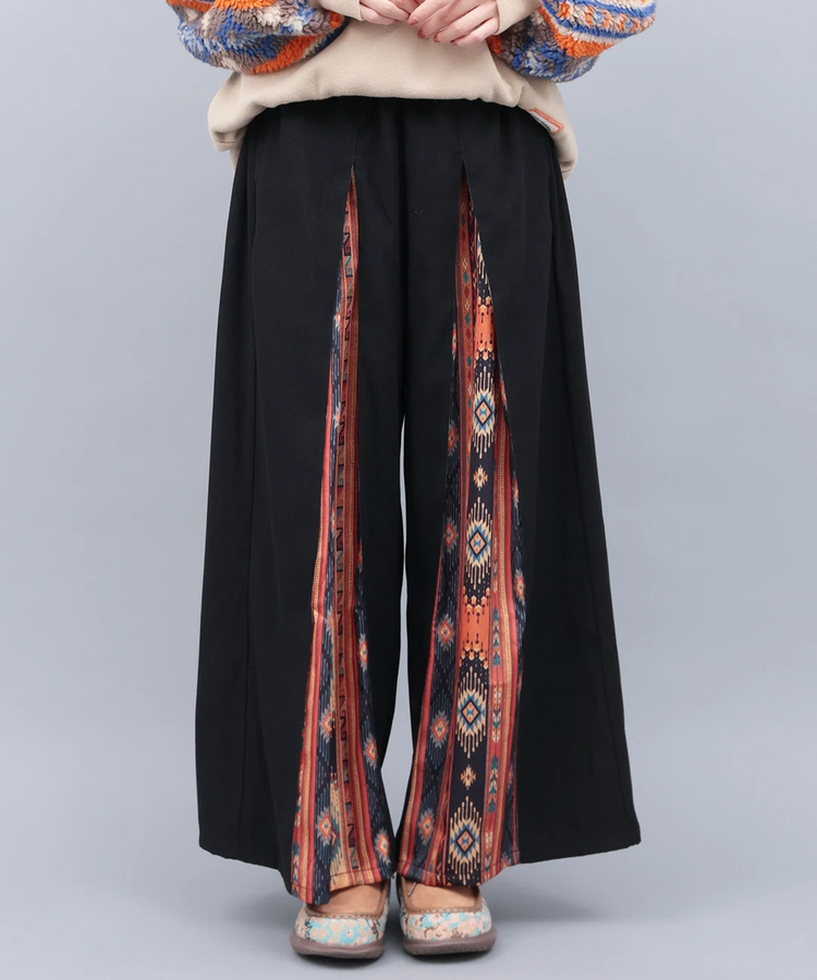 タックからエスニック柄がチラッと覗くワイドパンツ。スカート見えするゆったりワイドなシルエットで、脚のラインをカバー。