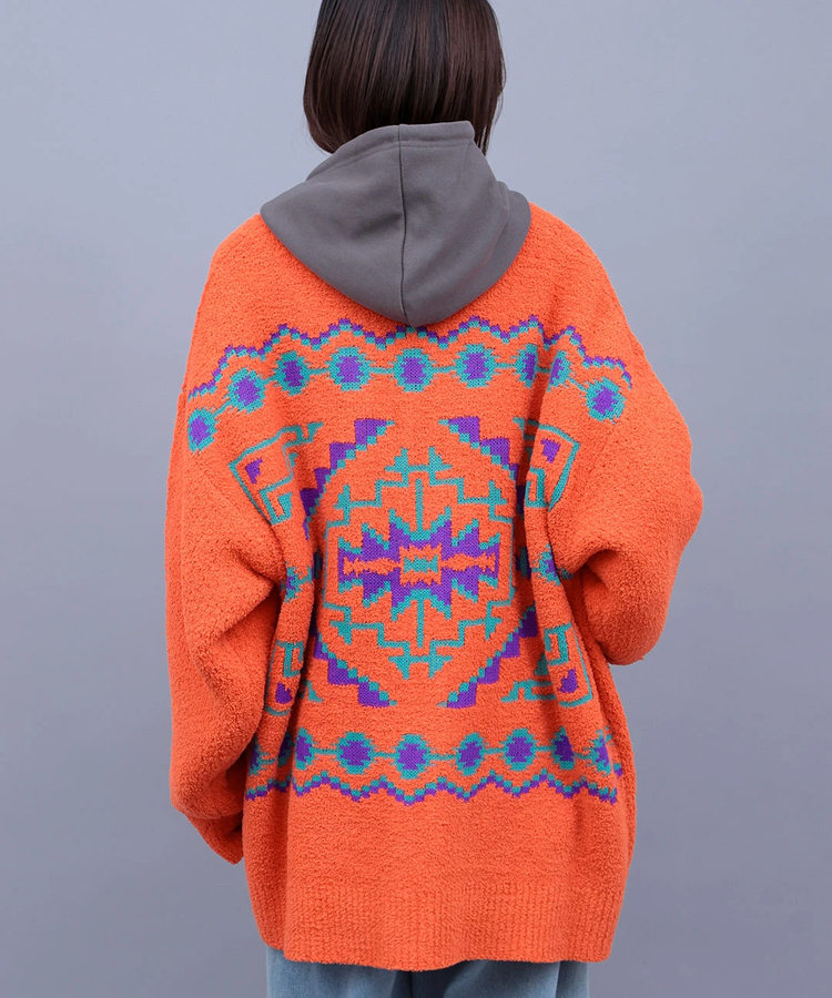 思わず触れたくなる、ふわふわの肌触りが心地よいモールニットカーディガン。背中とポケットには、ネイティブアメリカンが織るラグ柄をジャカードで大胆に表現し、存在感のある1枚に仕上げました。