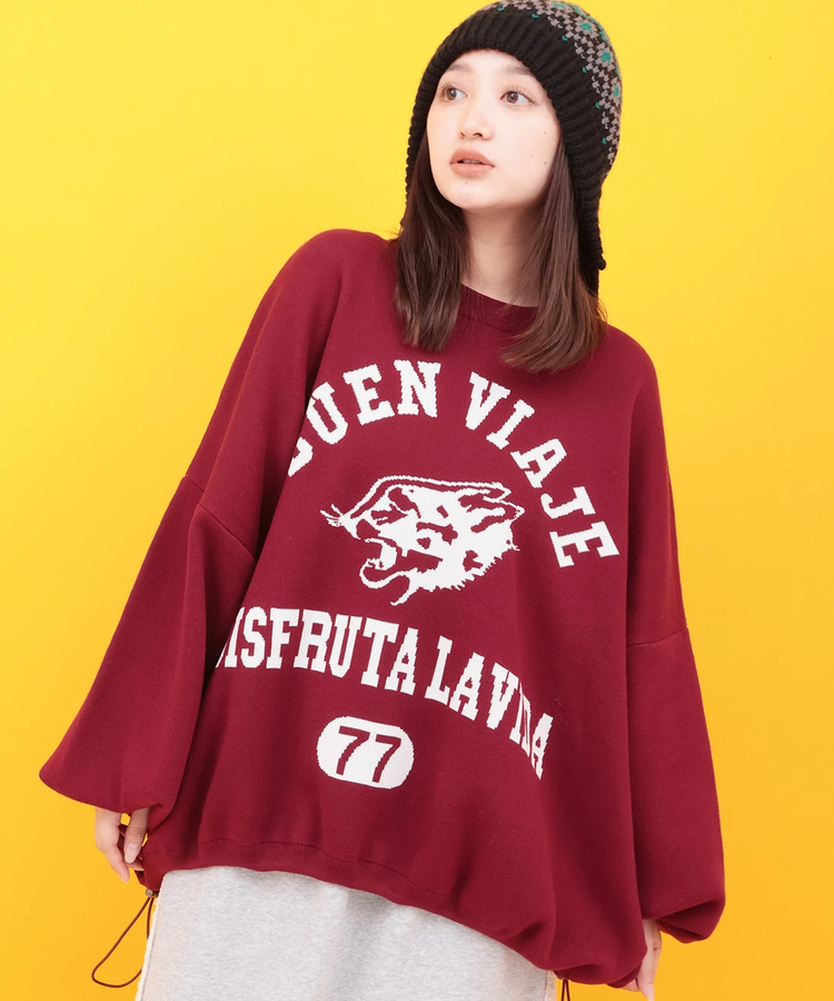 スウェット感覚で着られるカレッジロゴニット。ロゴは「buen viaje(よい旅を)」というスペイン語で、ほかにはないデザインです。