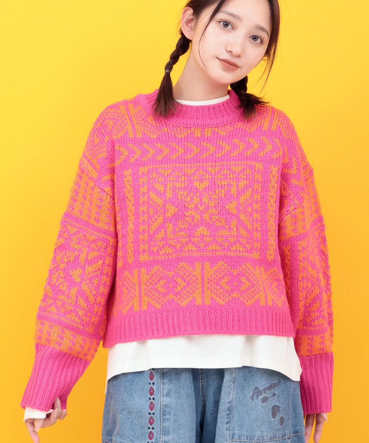 鮮やかなカラーと目を惹く配色が可愛いショート丈ニットプルオーバー。ゆるりとしたドロップショルダーとバランスが良くなる短めの丈感がポイントです。