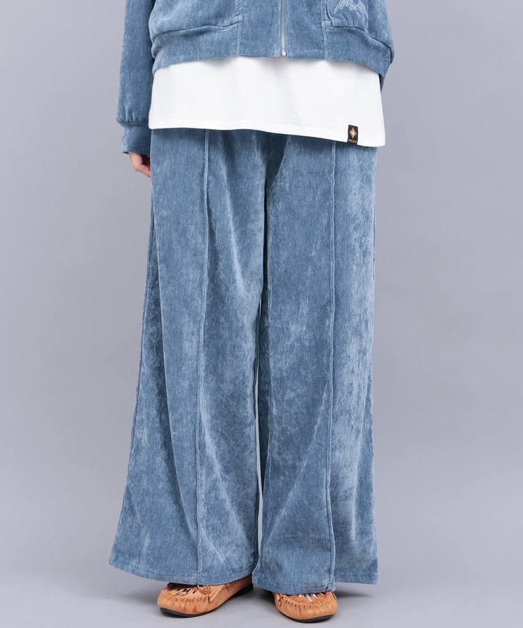 マットな光沢が上品なモール生地のセンタープレスパンツ。ワイドシルエットながら、センタータックで縦のラインを強調しすっきり見えを実現。