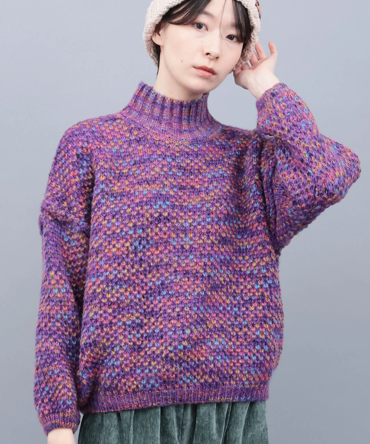 さまざまなカラーをミックスした、表情豊かなメランジ風ニットトップス。シンプルなハイネックデザインで使いやすく、着るだけでコーデの主役になる存在感◎