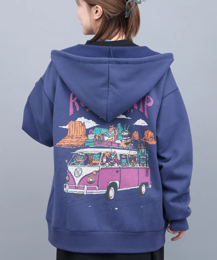 人気のパーカーに裏起毛バージョンが登場!バックにチビカチナドールたちのロードトリップを描いた個性あふれるデザイン。かすれ加工を施したヴィンテージ風で程よいこなれ感を演出。