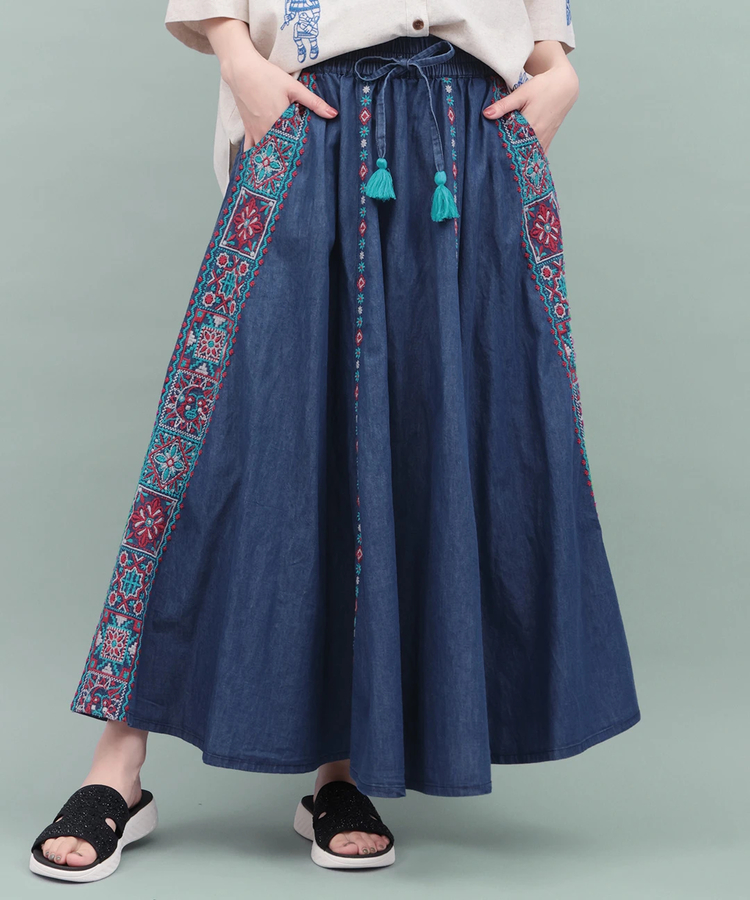 メキシコタイルをモチーフにしたオリジナル柄を、刺繍で贅沢に表現したフレアスカート。刺繍はサイドにライン状に施しているため、すっきりとした印象で着こなせます。
