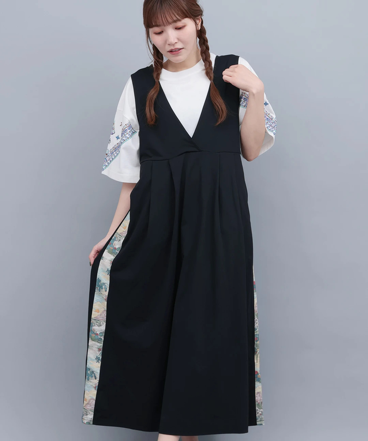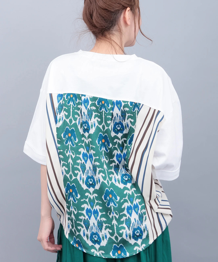 背中に大胆なエスニック柄をあしらった、存在感たっぷりの異素材コンビトップス。柄×柄の組み合わせも色味を揃えることで、派手すぎず大人っぽくまとまるデザインに仕上げました。