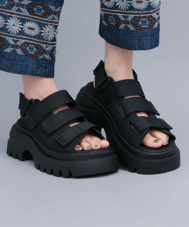 様々なコーデにマッチしてくれる厚底サンダル。3か所のストラップがしっかり足をホールドし、甲の部分と足首部分のベルトでサイズ調整が可能!