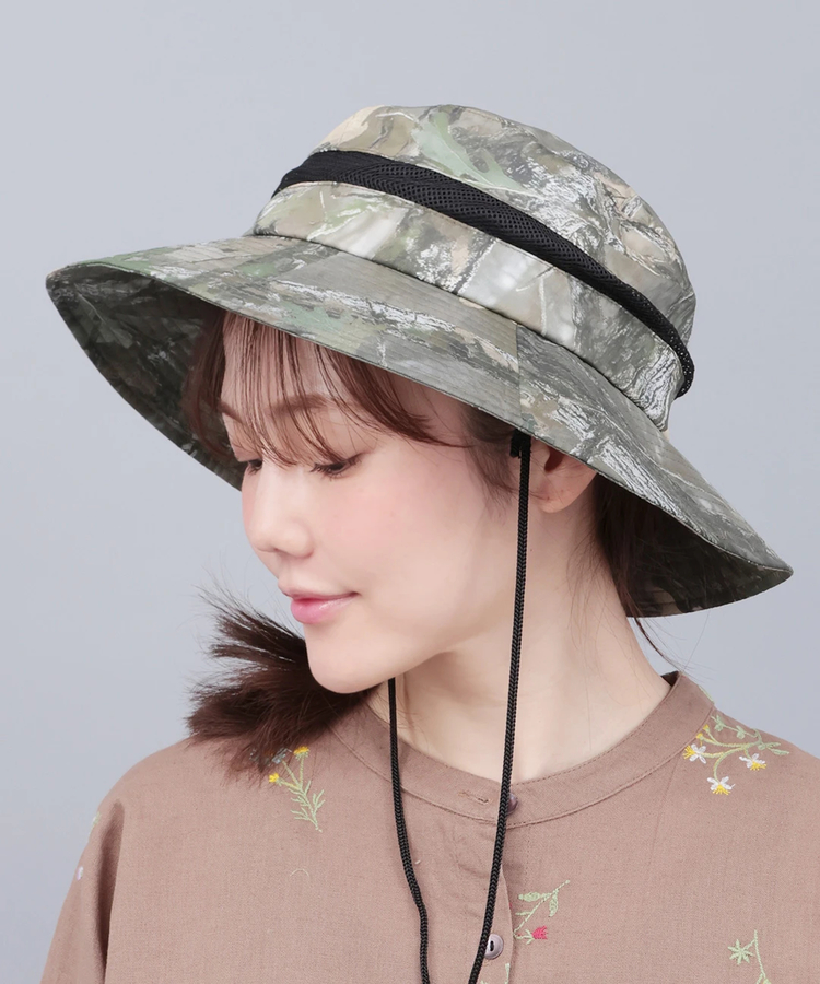 カモフラージュ柄が目を惹くアドベンチャーハット。遮光遮熱生地を使用し、日傘のように日差しや紫外線、熱からしっかり守ってくれるのがうれしいポイント。