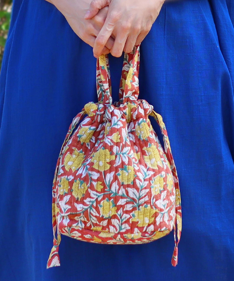心癒される優しい花柄がフェミニンな印象のブロックプリントの保冷巾着バッグ。500mlのペットボトルが縦に入る大きさなので、ドリンクの持ち運びにもおすすめです。