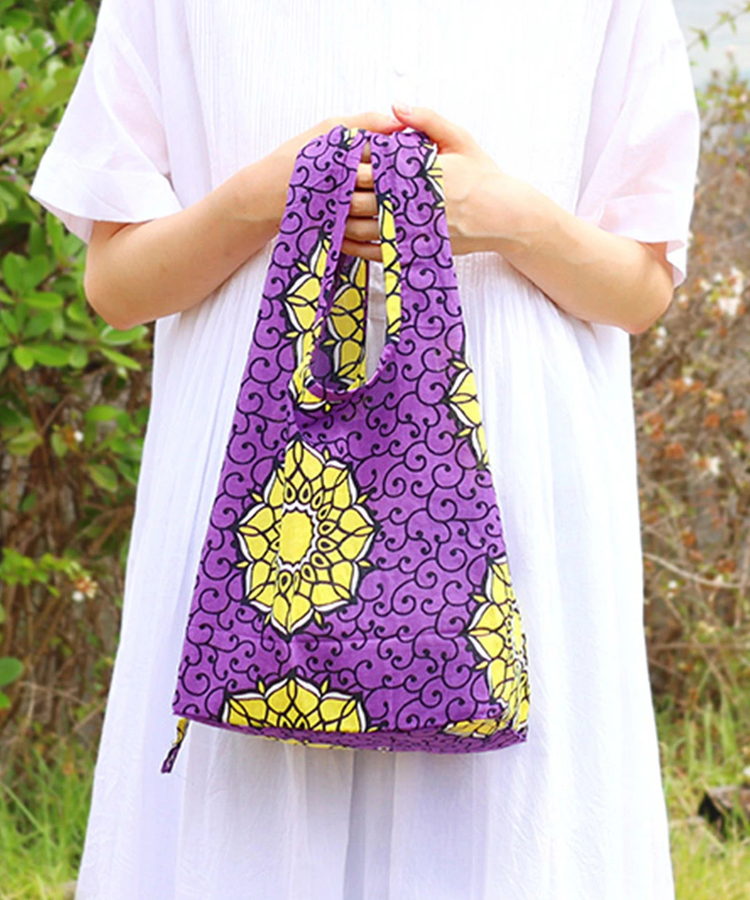 元気のでるビビッドなアフリカンプリント柄のエコバッグです。3つに折って収納できるのでとってもコンパクト!しっかりマチがついているのでいっぱい入るのが嬉しいアイテムです。