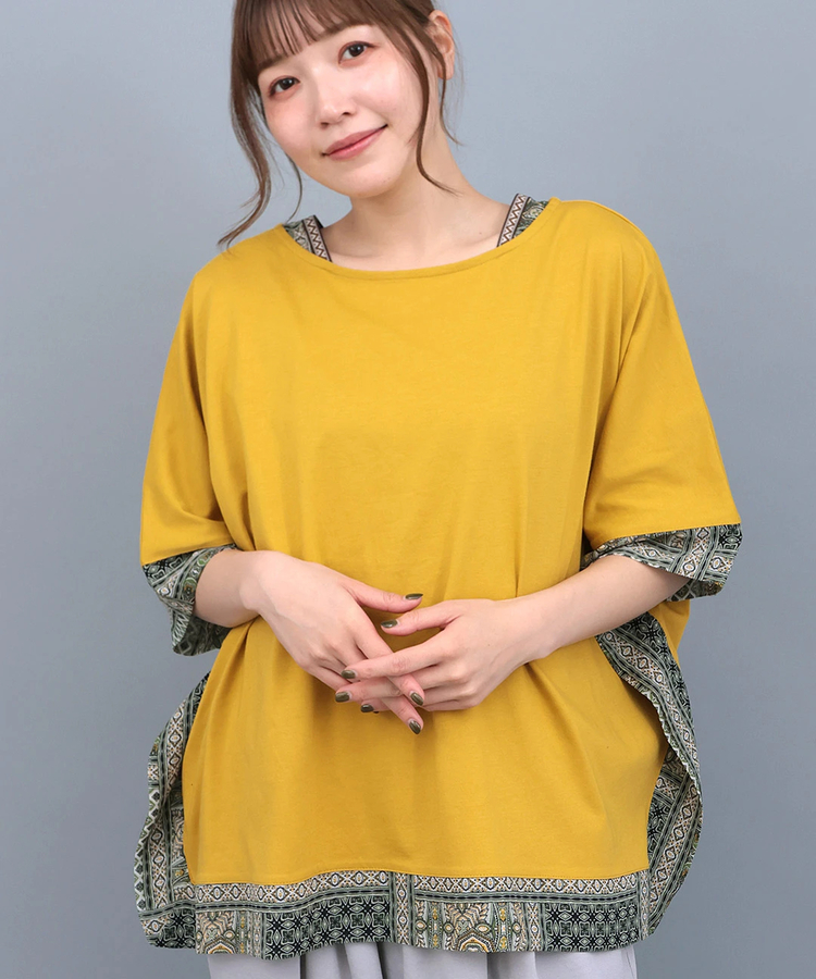 レイヤード風デザインが目を引く、エスニックテイストのトップス。とろみのある素材で、動きのあるシルエットに仕上げました。