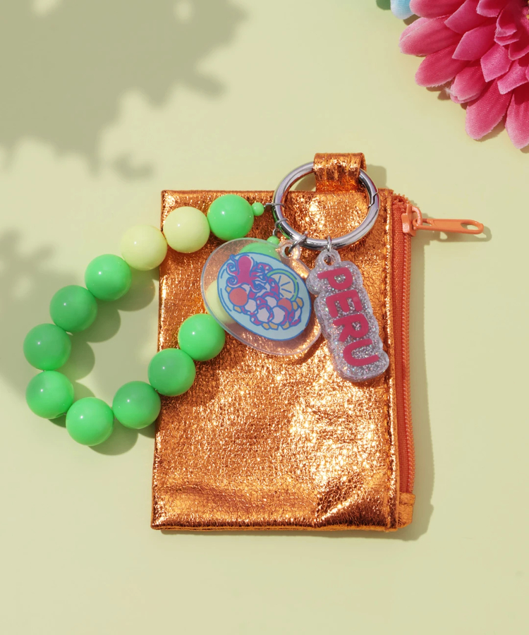 世界中のおいしい食べ物をモチーフにしたアクリルパーツが付いた、キラキラミニポーチ。カードサイズほどのコンパクトな大きさで、目薬やリップ、小物の収納にちょうどいいサイズ感です。