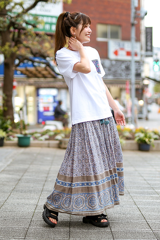 合わせるアイテムの引き立て役にもなる白T!総柄スカートを合わせれば全体が程よく調和した大人っぽいスタイルになる。