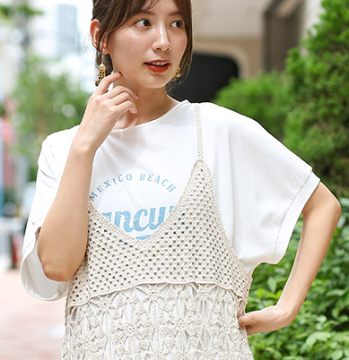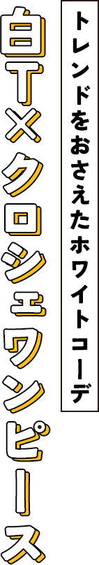 クロシェのワンピースでトレンド感も入れつつ、白アイテムでまとめることでレイヤードスタイルも涼しげに!