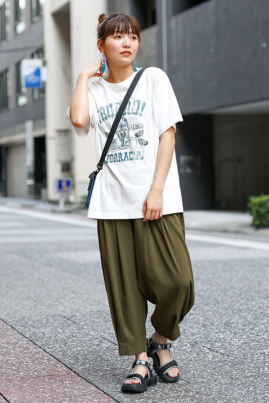 大人気のたまご型パンツに合わせたゆったりラフコーデ。丸みのあるボトムスでボーイッシュになりすぎずシンプルなのに可愛い雰囲気に。