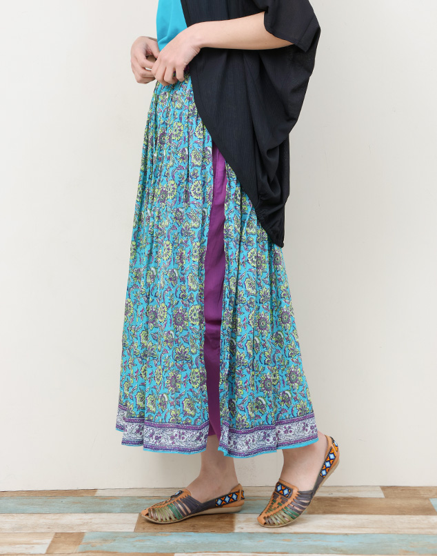 ゆるっとしたパンツの上に生地を重ねた、スカート見えするパンツ。落ち着いた色味のバイカラーで、歩くたびにちらりとパンツの色を覗かせる粋なデザインになってます。
