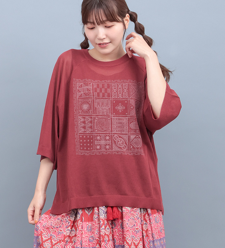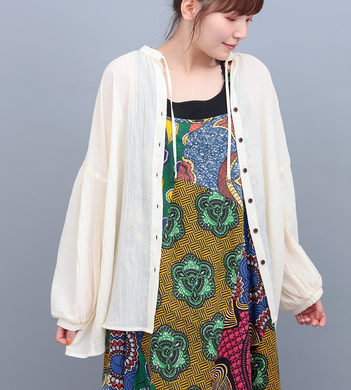 アフリカのアディレ調のプリントをさりげなく施したシアートップスとインナータンクトップのセット。それぞれ別々にも着られて、着回し力抜群!オーバーサイズでざっくりラフな着こなしになります。