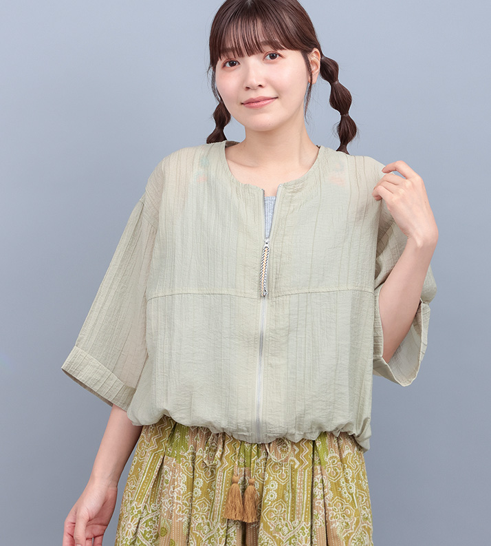 シャツ感覚でサラっと気軽に羽織りやすいシアーアウター。スッキリとした丈感とルーズな身幅で今っぽい着こなしに。フロントチャックとドロストコードが上品になりすぎず、カジュアルな雰囲気も漂わせます。