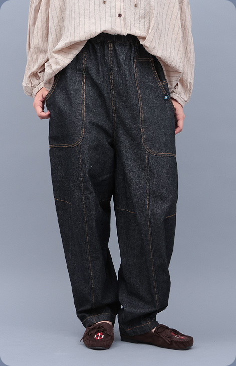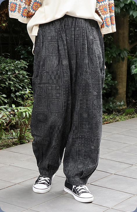 フロントのタックで腰まわりにゆとりを持たせ、裾はほんのりテーパードで、たまごのような丸みのある独特のシルエット。ナイジェリアのヨルバ族伝統の藍染布「Adire(アディレ)」模様を、デニム生地に抜染プリントで表現したオリジナルテキスタイルが魅力。