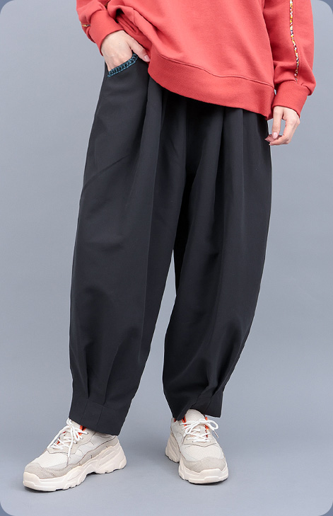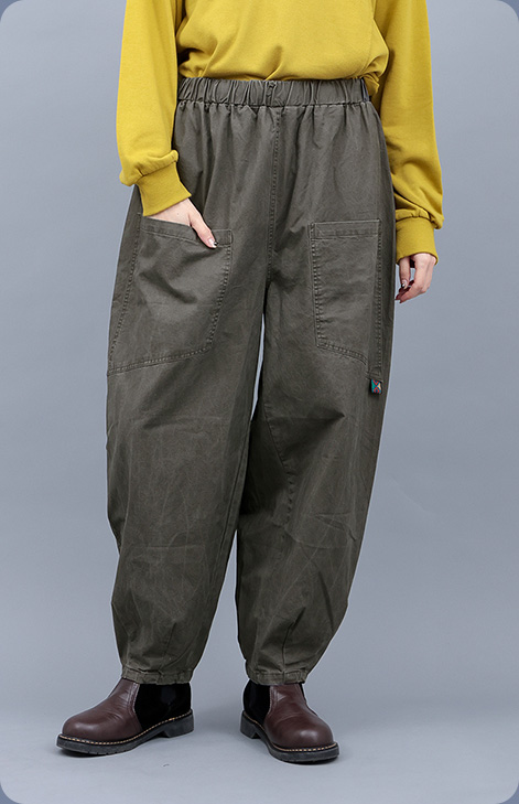 ぽってりとした丸みのあるタマゴ型シルエットが可愛い大人気のパンツ。生地をリニューアルし、微起毛のなめらかな肌触りと立体感のあるシルエットがさらに美しく◎ポケット部分の幾何学柄テープがさりげないアクセント。