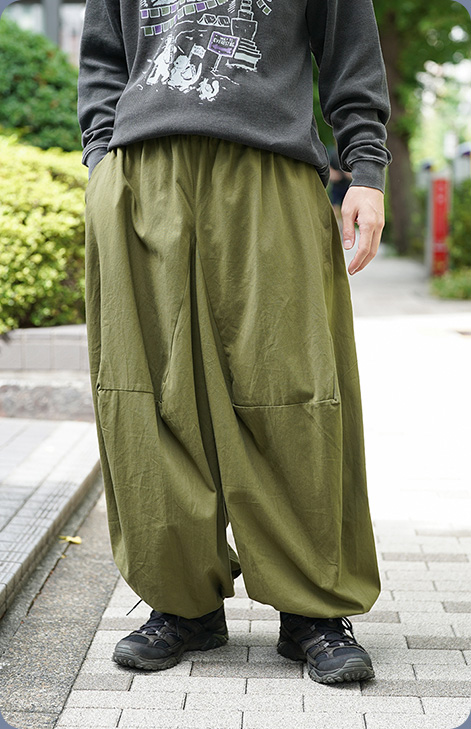 ゆったりとしたボリューミーなバルーンパンツ。ウエストはゴム&紐でリラックスした穿き心地に。ベルトループも付いているので、スタイリングの幅も広がります。