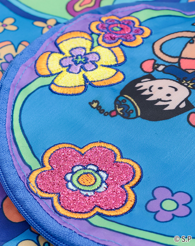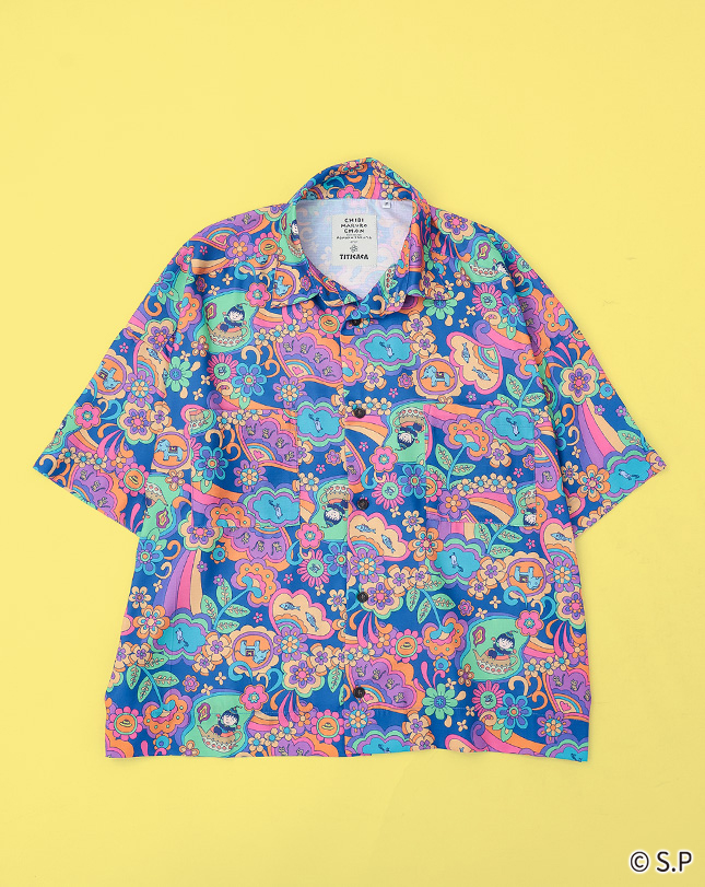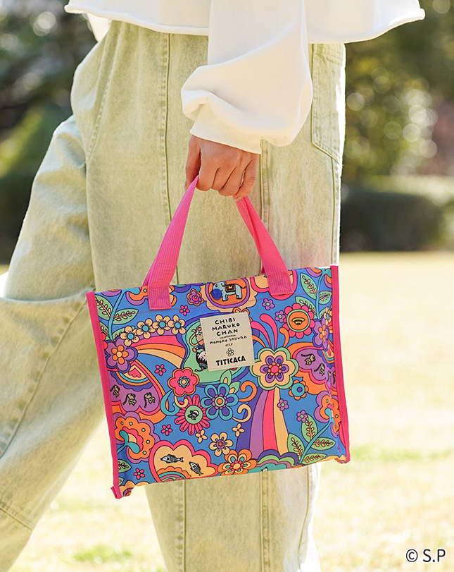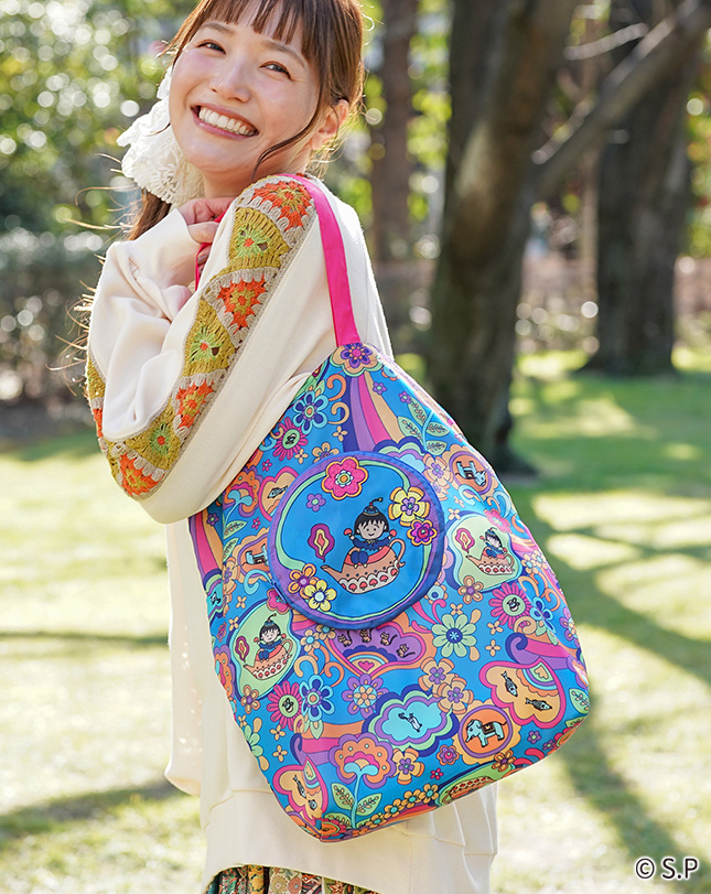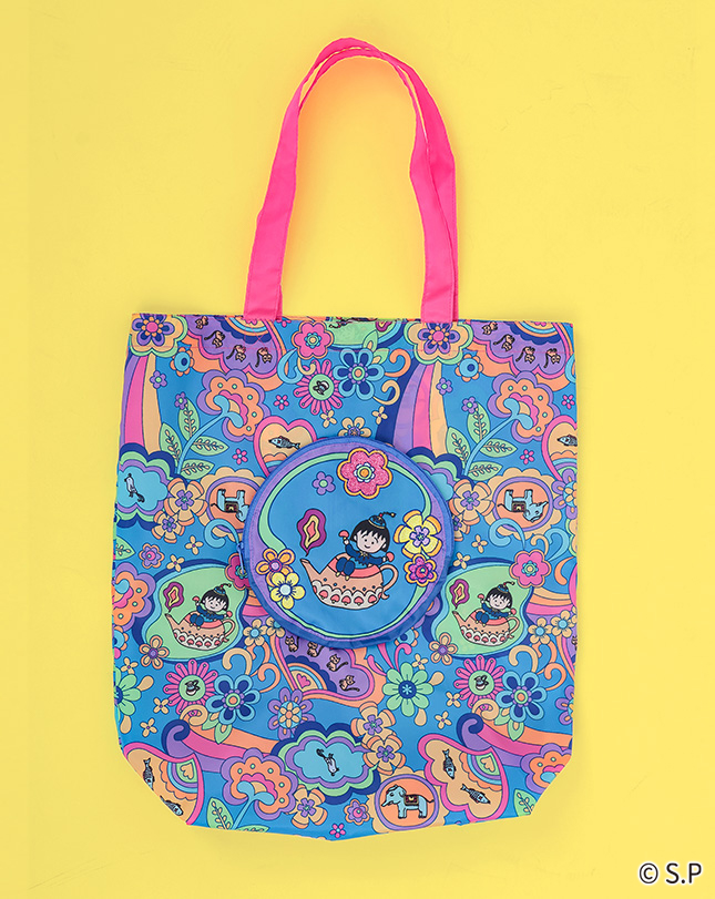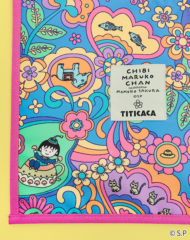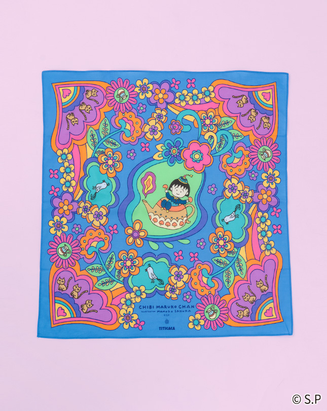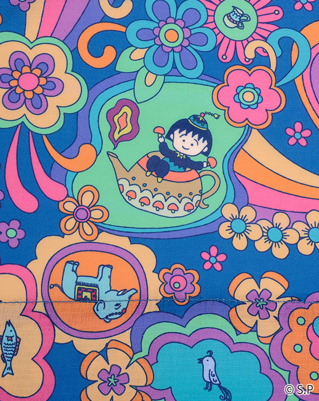 魔法のランプに入ったまるちゃんや動物たちが色とりどりの花々に囲まれた、ハッピーな気分になれる柄。