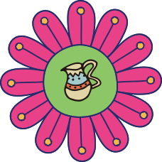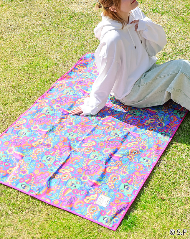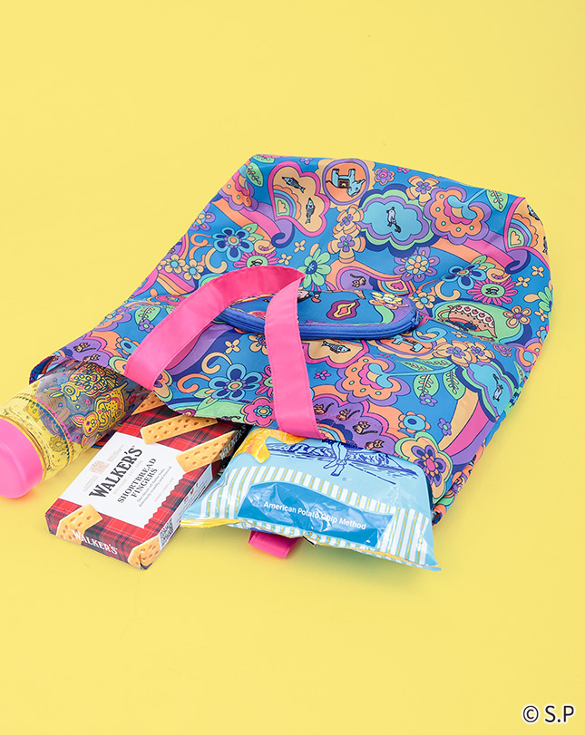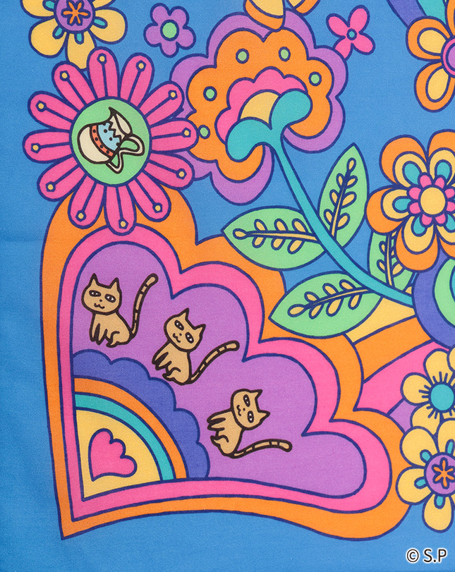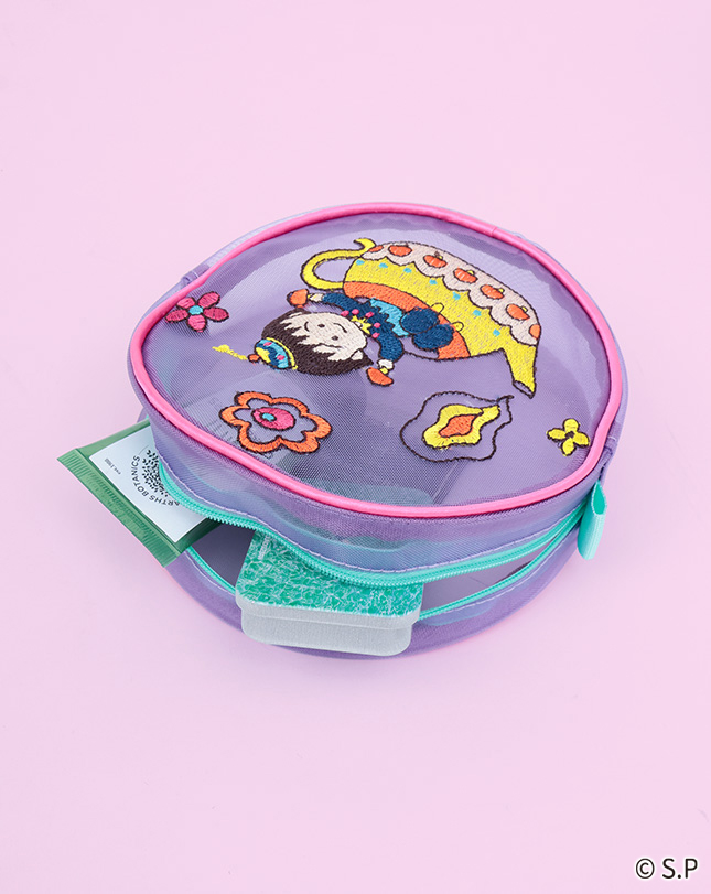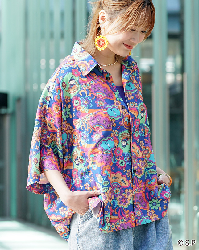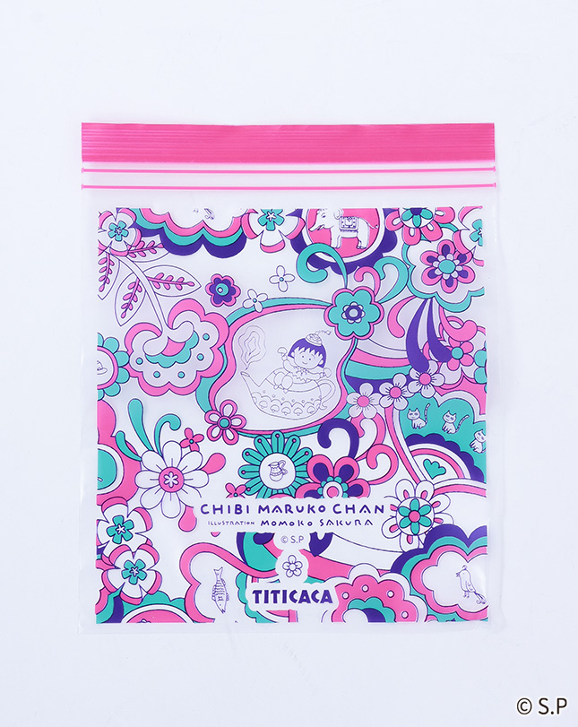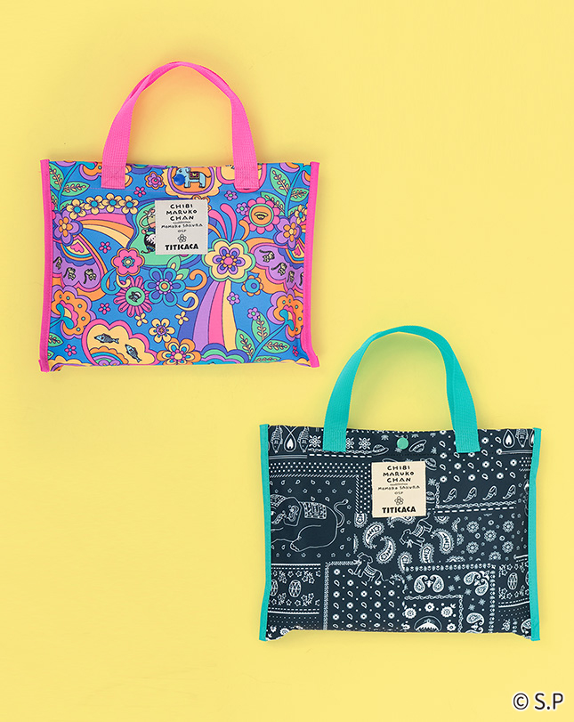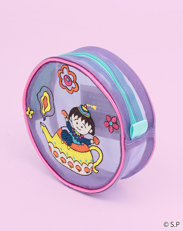 魔法のランプに入ったまるちゃんや動物たちが色とりどりの花々に囲まれた、ハッピーな気分になれる柄。